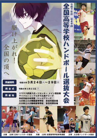 ★2025.10.29 小学生の皆様へ 「中学生ハンドボールチーム紹介」 ■2025.12.31 2025年度 大分県社会人リーグ大会 大会要項・申込書 大会要項 ■2025.12.23 第49回全国高等学校ハンドボール選抜大会 特設サイト開設 特設サイトはコチラ ■2025.12.21 12月20〜21日 九州高校選抜大分県予選の結果 ■2025.11.24 令和7年度 会長杯争奪小学生大会の結果 ■2025.11.02 令和7年度 大分県高等学校新人ハンドボール競技大会の結果 ■2025.10.19 令和7年度 大分県中学校新人体育大会 ハンドボール競技の結果 ■2025.07.21 2025年競技規則 改訂版発行のお知らせ (7月1日付) 日本ハンドボール協会 「2025年競技規則 改訂版発行のお知らせ」 ■2025.07.11 令和7年度 公認ハンドボールスタートコーチ養成講習会の開催について 開催要項 ■2023.06.09 JHA小学生専門委員会 U12カテゴリー『指導の指針』 ※関係する全ての皆様に周知のため、掲載いたします。 ※ご一読ください。 ■2023.12.01 大分県小学生ハンドボールチーム紹介 ■競技部・広報部からのお願い(競技マナー向上) ●県大会、▼九州ブロック大会、■全国大会・その他 ※日程は予定です。年度初めは作成中の箇所が多々ございます。詳細は主催者発表をご確認ください。